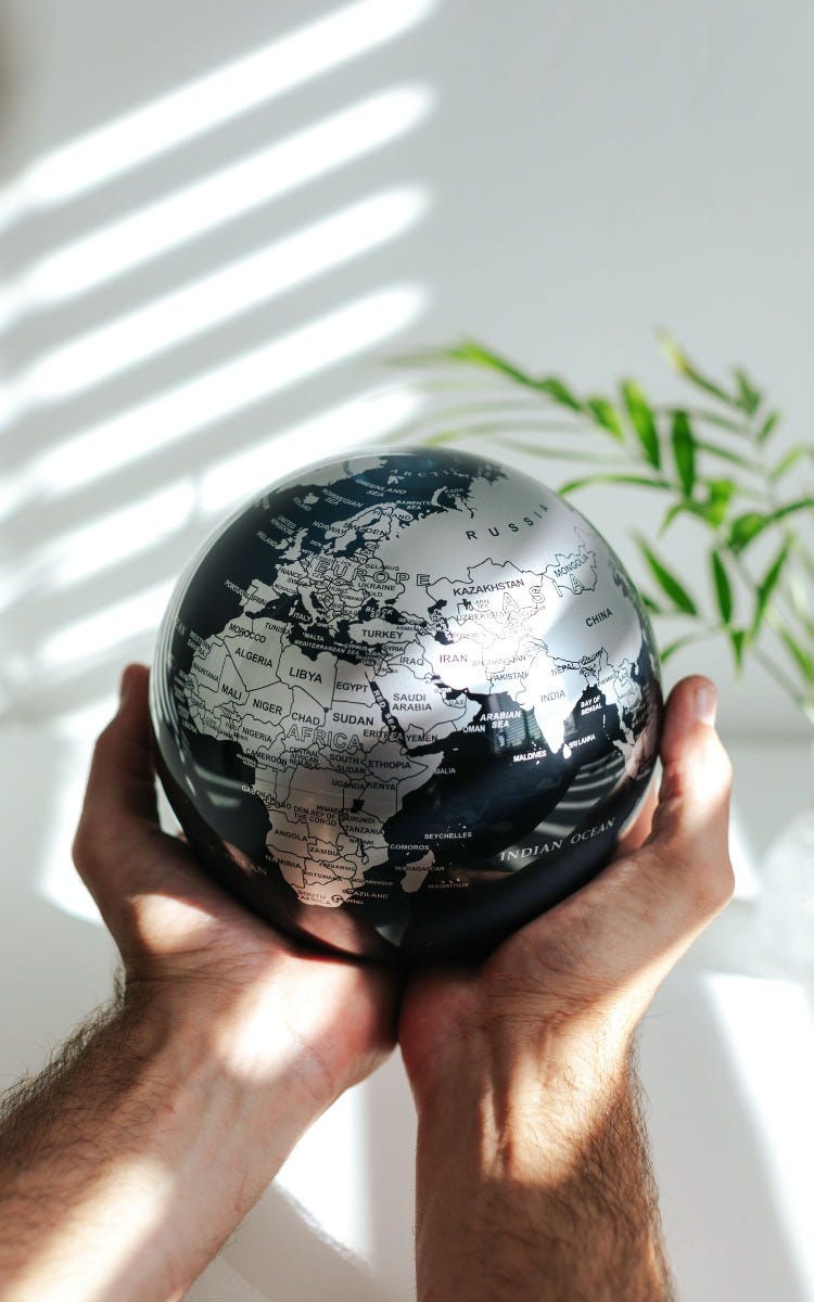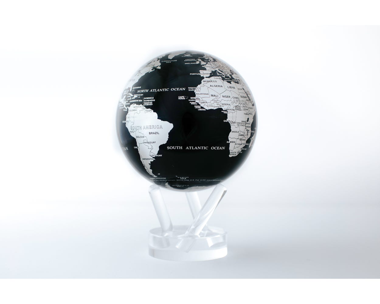 Metallic landmasses against dark blue oceans commingle on this refined world globe.