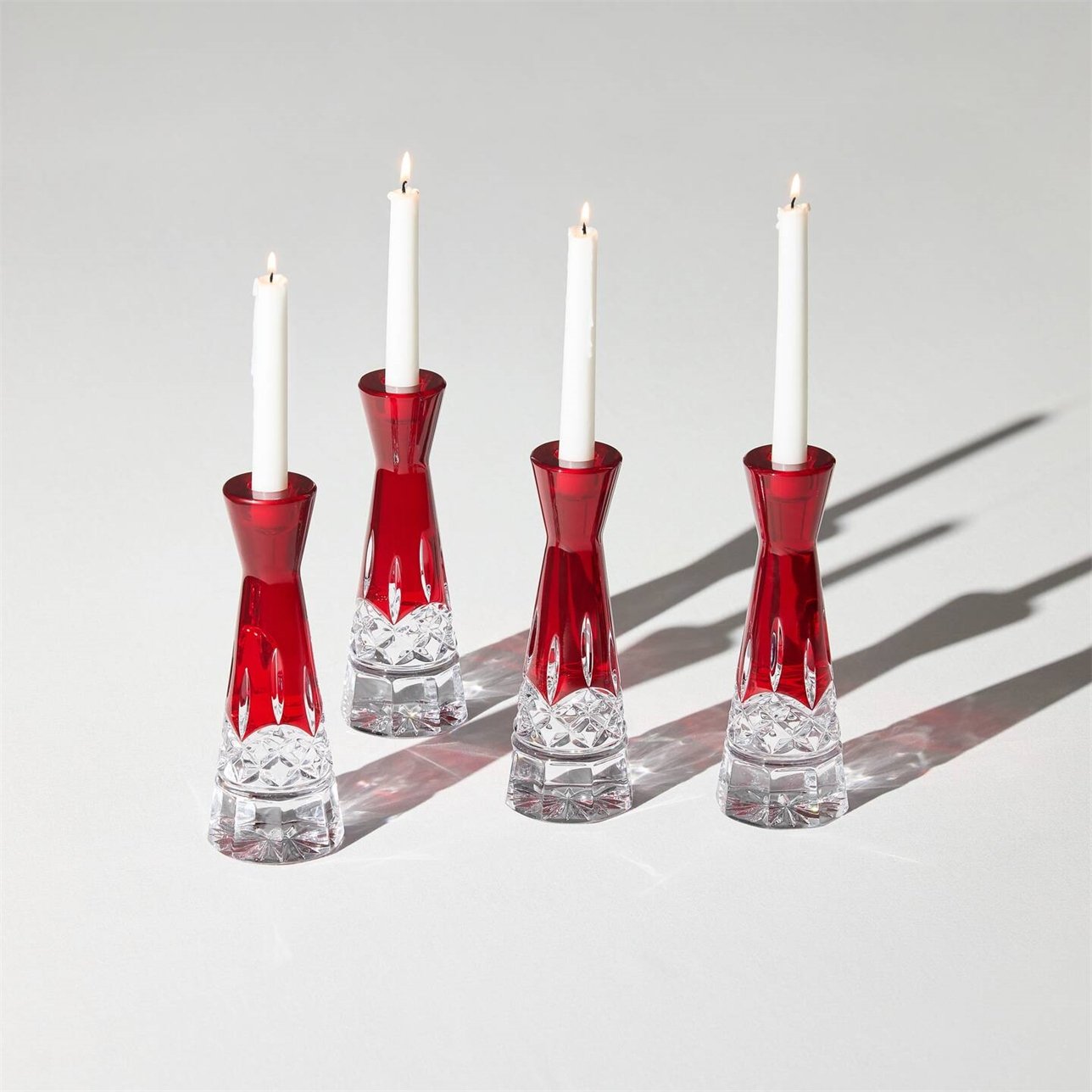 Set the ambience in the right style with the Waterford Lismore Candlestick Set. These slender candlesticks, featuring the beloved, Gothic-inspired Lismore pattern, start from a clear base and reach up in rich, deep red. This combination bridges a range of styles, making these designs perfect for any occasion, formal or casual, classic or contemporary.